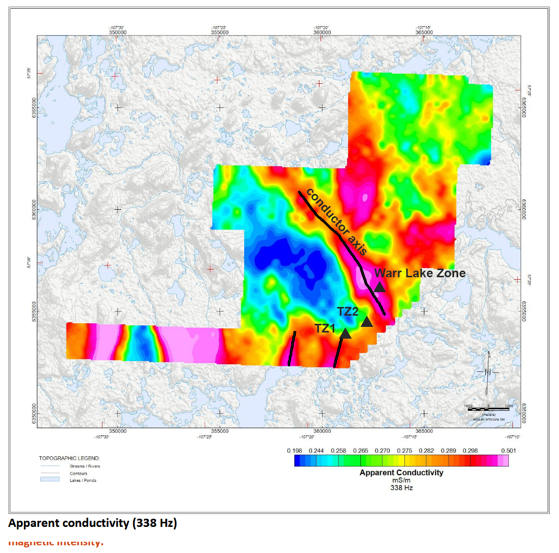 The preliminary interpretation identified a large-scale EM subsurface conductor, running NW and lying within a magnetic break. The roughly 10km conductive anomaly is coincident with the Warr Lake Zone, a radioactive zone identified by the Company in 2024. Conductive anomalies were also matched with TZ-1 and TZ-2. The Company has commissioned a in depth, comprehensive interpretation report, collating the MT dataset with historic datasets. Results are expected in the near term.